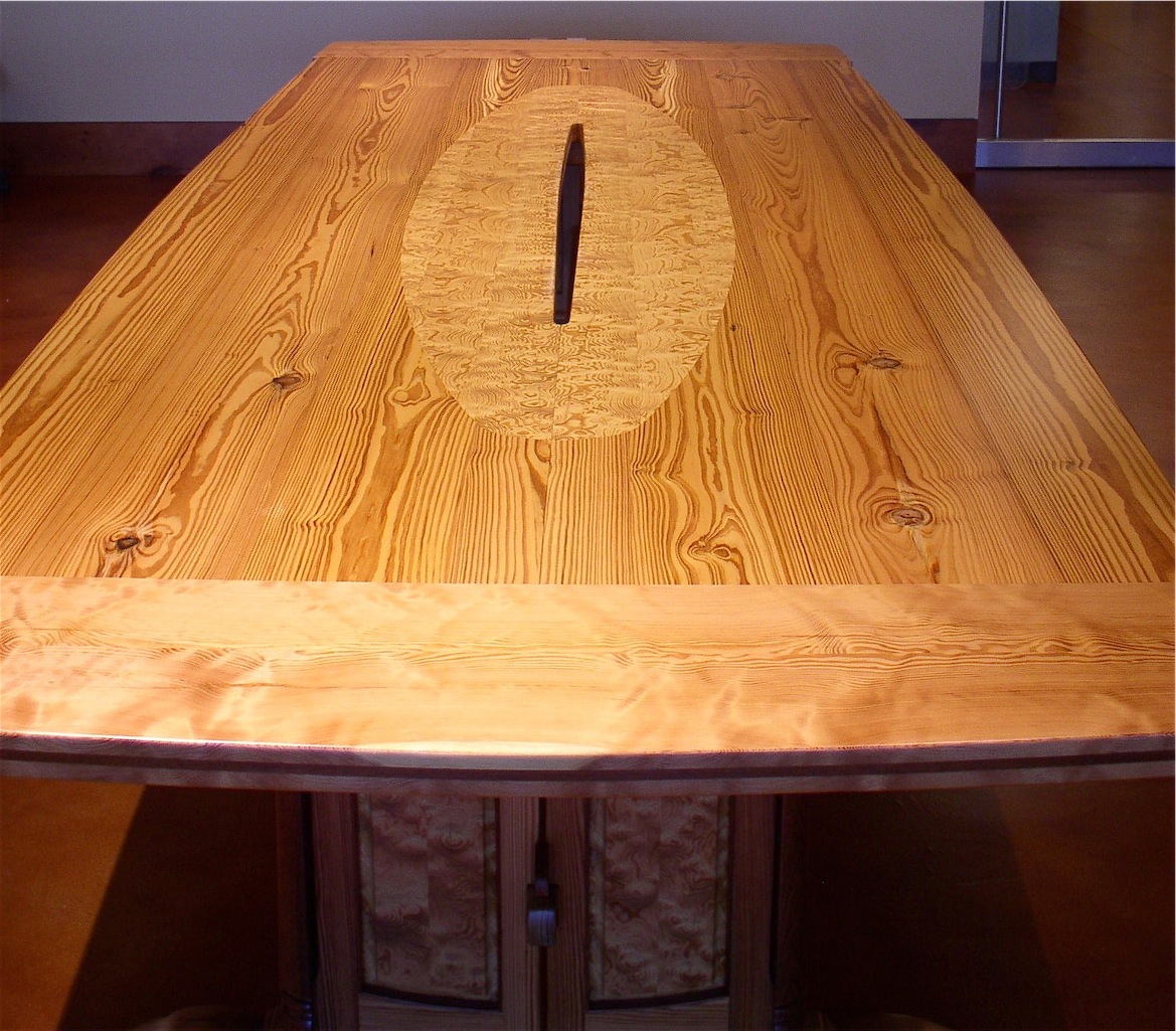The top, made entirely of solid wood,  comes apart down the middle after removing the breadboard ends at either end. The two halves of the top and the breadboard ends are held together with floating tenons and mechanical fasteners installed on the underside. Assembled, the top weighs nearly four hundred pounds. The breadboard ends and the oval inlay in the top are also curly pine.