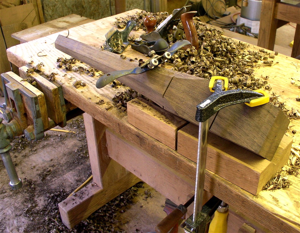 Using hand planes, scrapers, and sand paper I clean up the bandsaw marks and make sure everything looks smooth and symmetrical. Then I make a couple of V-blocks in 2″ material that will support my leg as I spoke shave and hand plane the four sharp edges of my leg into the other four facets that will create the octagonal shape. I think this photo will explain what I am trying to describe.
