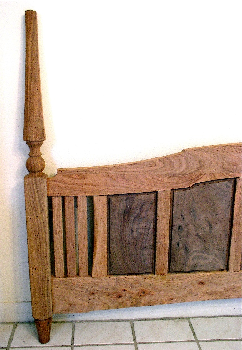 This is actually a follow-up to my recent post, Shaping And Turning A Tapered Table Leg. I am currently working on a queen-size bed in mesquite and figured walnut where I am employing the same techniques in making the bedposts as I used in creating the tapered table legs. Just hoping to show that these methods have broader applications. Here is a view of the footboard.