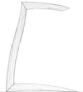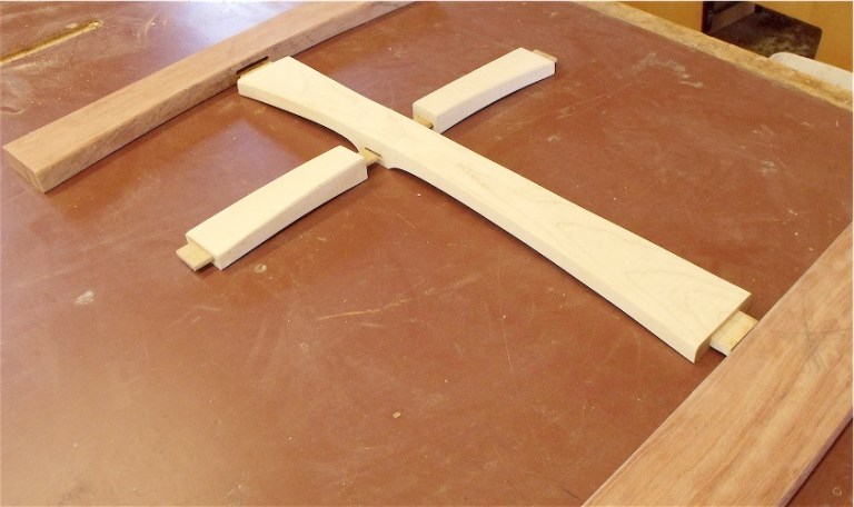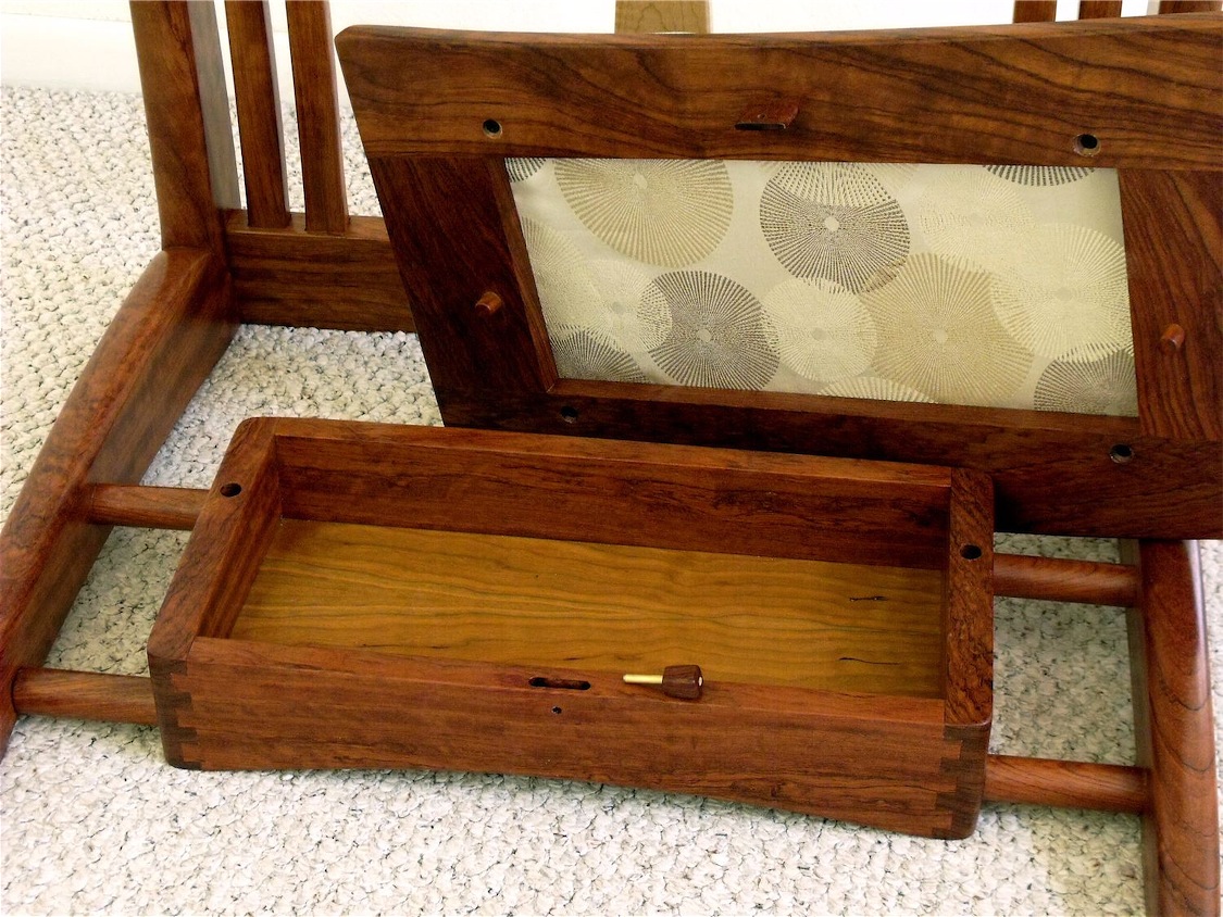 The construction process did not happen nearly as quickly. I thought I could build it in two weeks, but it took me three. Yes, yes. I wound up doing it for love, beauty, and soul satisfaction rather than the money. Unfortunately one cannot eat soul satisfaction. Well, there is a lot of curving and tapering going on in the parts of this piece and many of the joints intersect along curves and at angles other than 90 degrees. It all looks visually simple, but it took much head scratching and careful cutting to get things to come together cleanly and precisely, and I had to pay attention to the ergonomics so that it would be a kneeler that is actually comfortable to kneel at.