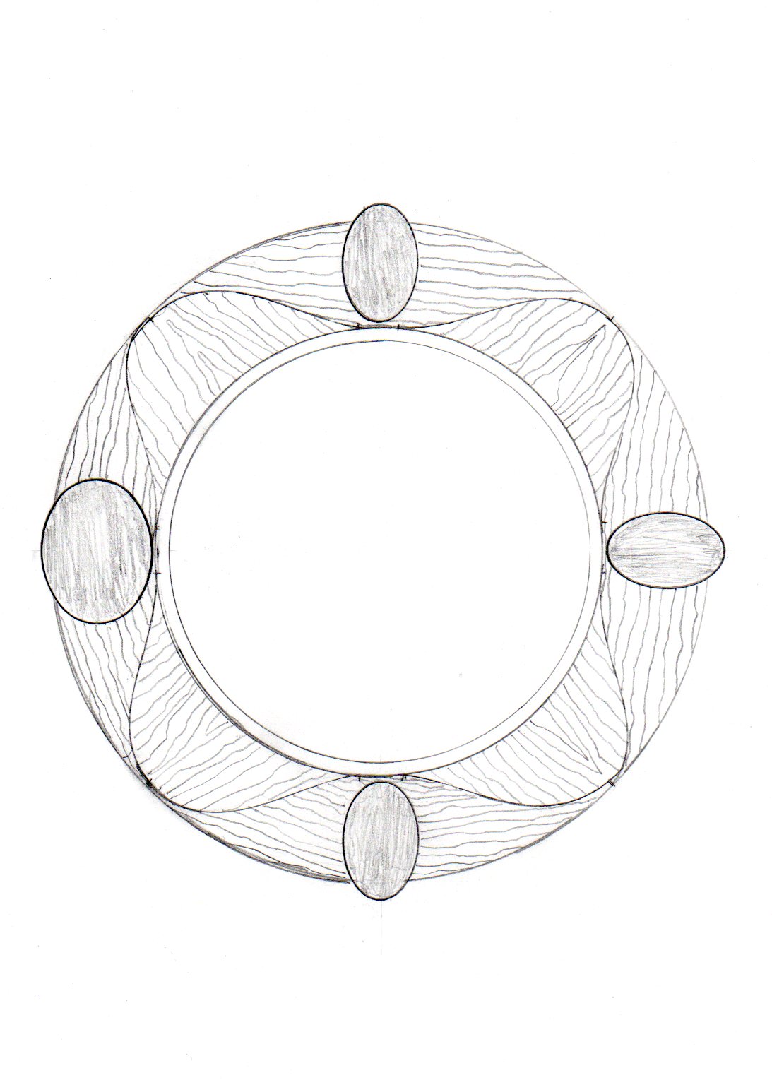 The primary materials are figured bubinga and wenge. The carvings are in mahogany and were done by Austin, Texas artist and carver, Chaz Chapot. His carvings set off the stand beautifully. The carvings are actually inlaid into the rim.