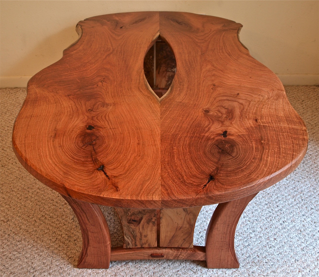 mesquite coffee table7This table is my first completed piece in 2013. It is also my first “live edge” table where I have left much of the undulating, natural edge on the two book-matched slabs that make up the top.